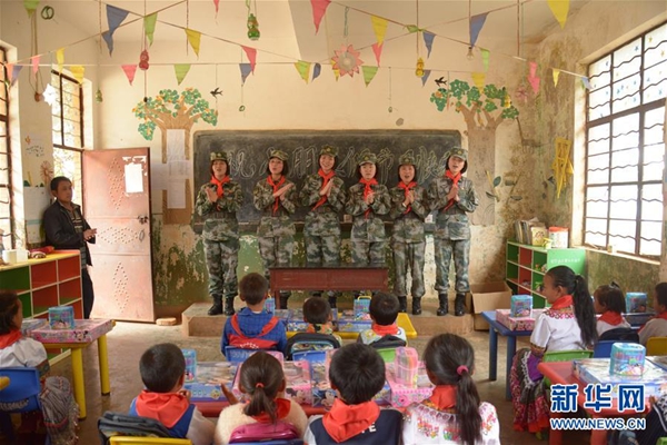 第75集團軍某特戰旅指揮通信連大學生女兵到駐地甸沙鄉草海子小學支教(2017年6月1日攝)。新華社發(張正舉 攝)