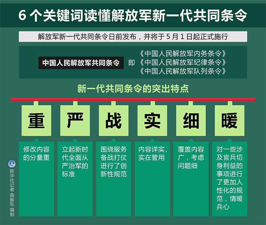 新華社北京4月15日電(記者黎云、劉濟美)解放軍新一代共同條令日前發布,并將于5月1日起正式施行。記者從中央軍委訓練管理部采訪獲悉,“重、嚴、戰、實、細、暖”6個關鍵詞,是新一代共同條令的突出特點。