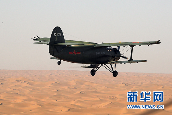 空軍運-5B飛機在騰格里沙漠上空進行飛播作業(5月31日攝)。新華社發(劉彥令 攝)