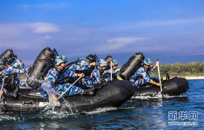 海軍陸戰隊某旅偵察營在三亞某海域開展劃舟訓練(11月20日攝)。新華社發(范旭東 攝)