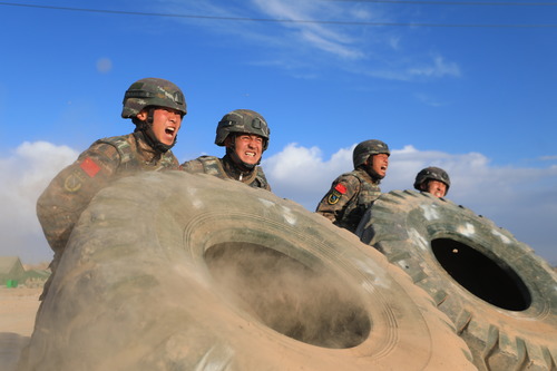 ????武警新疆總隊某機動支隊特戰(zhàn)一中隊組織官兵進行翻輪胎體能訓練(10月30日攝)。新華社發(fā)(張文 攝)