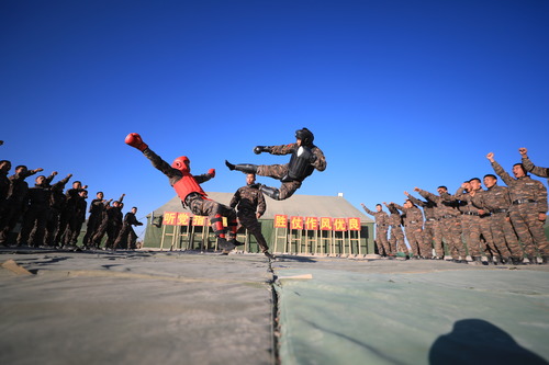 ????武警新疆總隊某機動支隊特戰(zhàn)一中隊組織官兵開展搏擊訓練(10月31日攝)。新華社發(fā)(張文 攝)