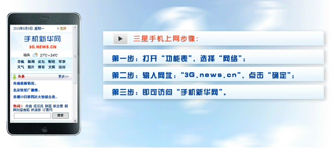 三星:依次選“上網鍵”-“收藏夾”-選擇一個空的收藏夾地址-確認url地址-輸入“手機新華網”