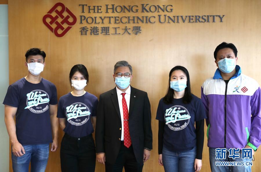 這是“愛無疆”團隊成員合影。他們是(自左至右):香港理大康復治療科學系職業(yè)治療學三年級學生李穎東、香港理大康復治療科學系職業(yè)治療學四年級學生李舒平、香港理大康復治療科學系系主任曾永康、香港理大康復治療科學系職業(yè)治療學三年級學生梁熙童、香港理大康復治療科學系職業(yè)治療臨床導師鄧健聰(2020年12月12日攝)。新華社記者 吳曉初 攝