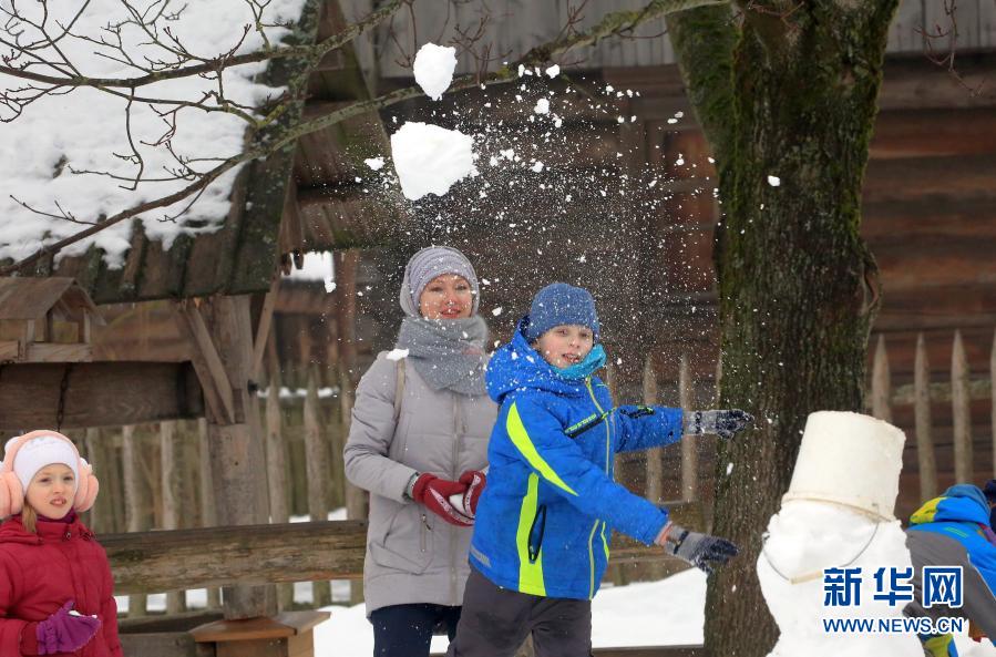 1月24日,孩子們在白俄羅斯首都明斯克郊區的民族建筑博物館內打雪仗。新華社發(任科夫攝)