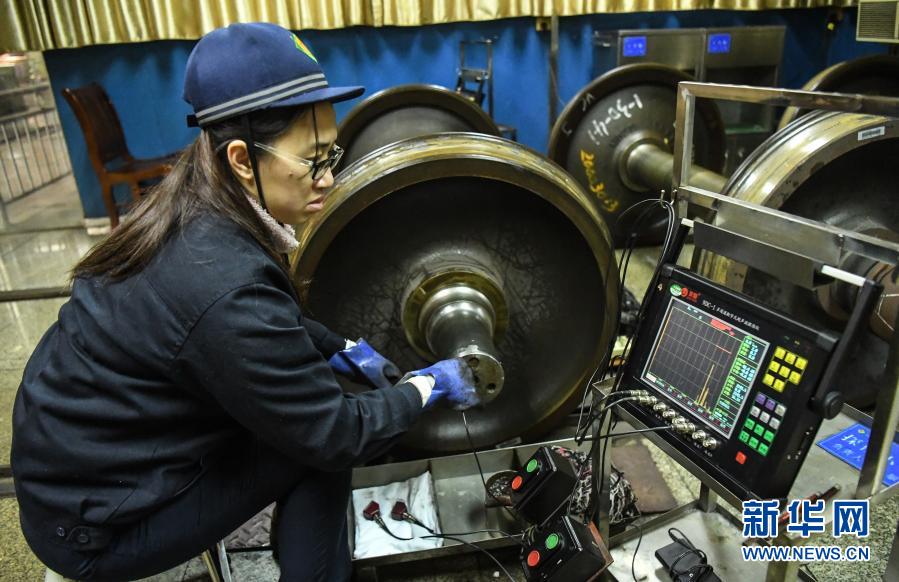 2月1日,柳州車輛段車輪車間無損檢測員黃婷對輪對進行探傷檢查。新華社記者 張愛林 攝