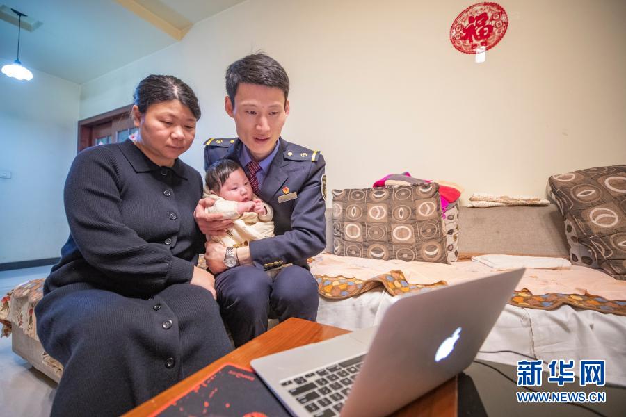 2月10日,在重慶市渝中區的家中,付寶印與妻子孫夢潔一起抱著兒子同吉林老家的母親視頻通話。新華社記者 黃偉 攝