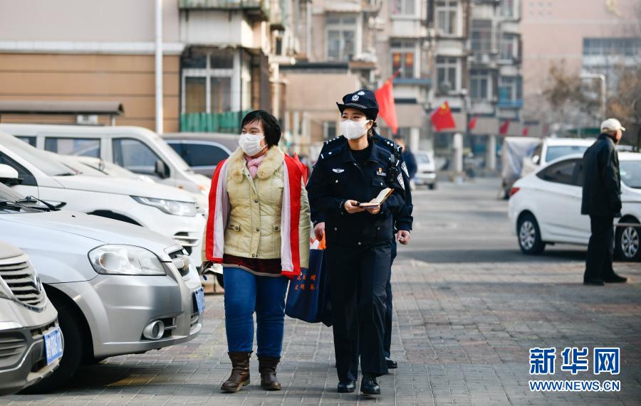 2月11日,在天津市紅橋區隆春里社區,楊曉惠(右)與隆春里社區居委會網格員劉志鑫(左)聯合巡邏,查看小區安防情況。新華社發(孫凡越攝)