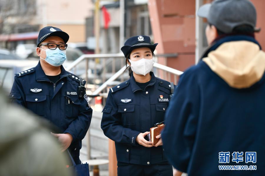 2月11日,在天津市紅橋區(qū)隆春里社區(qū),楊曉惠(中)與輔警郝旭(左)向晨練的社區(qū)居民問(wèn)詢社區(qū)情況。新華社發(fā)(孫凡越攝)