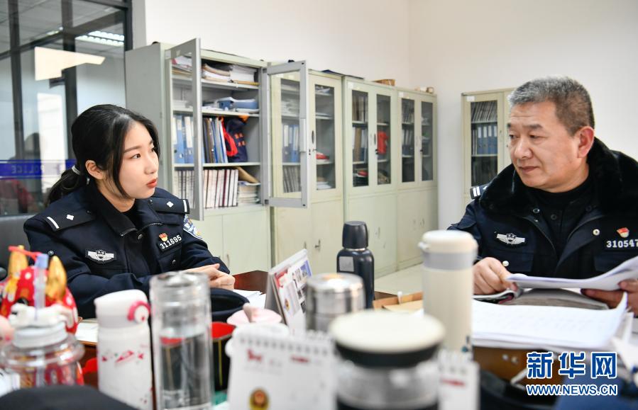 2月11日,在天津市紅橋區芥園派出所,楊曉惠向社區老民警請教問題。新華社發(孫凡越攝)