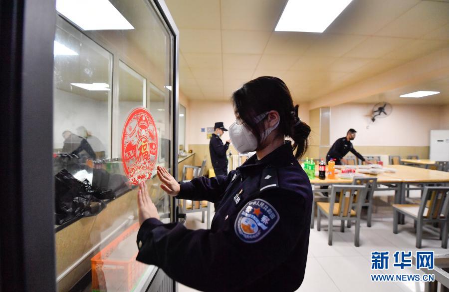 2月11日,在天津市紅橋區芥園派出所的餐廳,楊曉惠在吃年夜飯前貼窗花。新華社發(孫凡越攝)