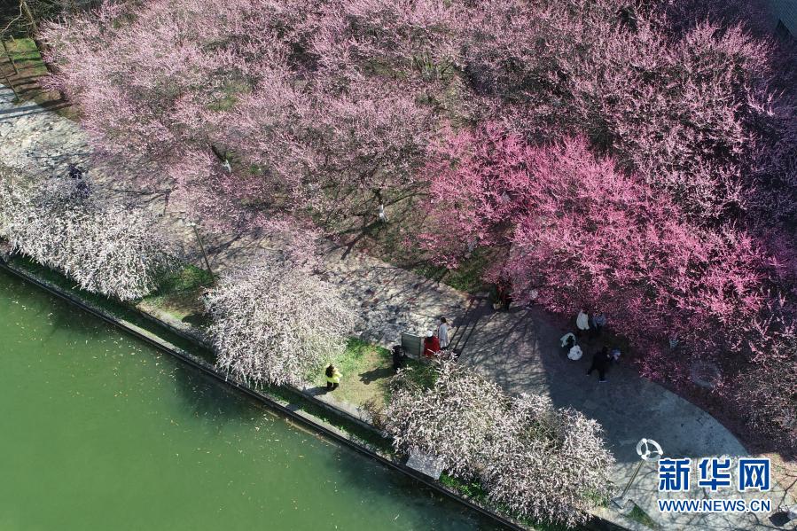 2月14日,在湖南省湘西土家族苗族自治州吉首大學(xué),市民在梅園里賞花(無(wú)人機(jī)照片)。新華社發(fā)(彭彪 攝)