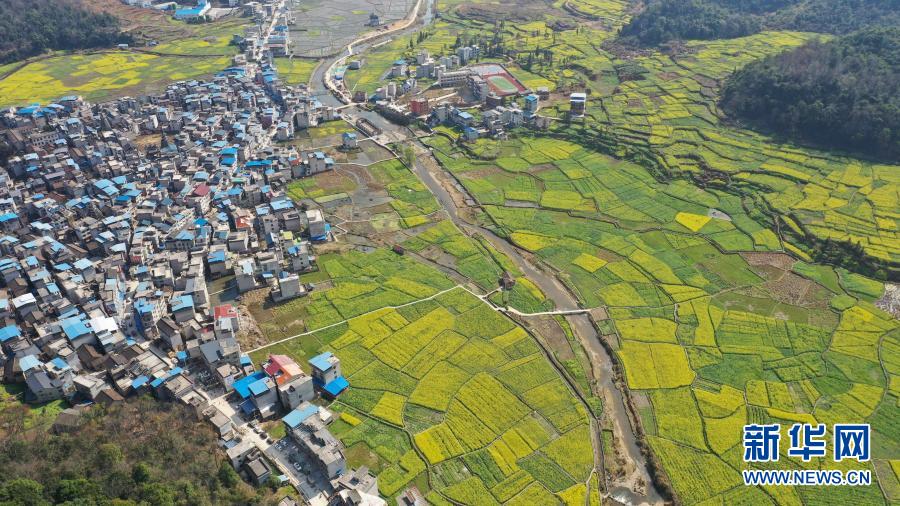 2月14日在貴州省黔東南苗族侗族自治州黎平縣拍攝的油菜花田(無人機照片)。新華社發(李長華 攝)
