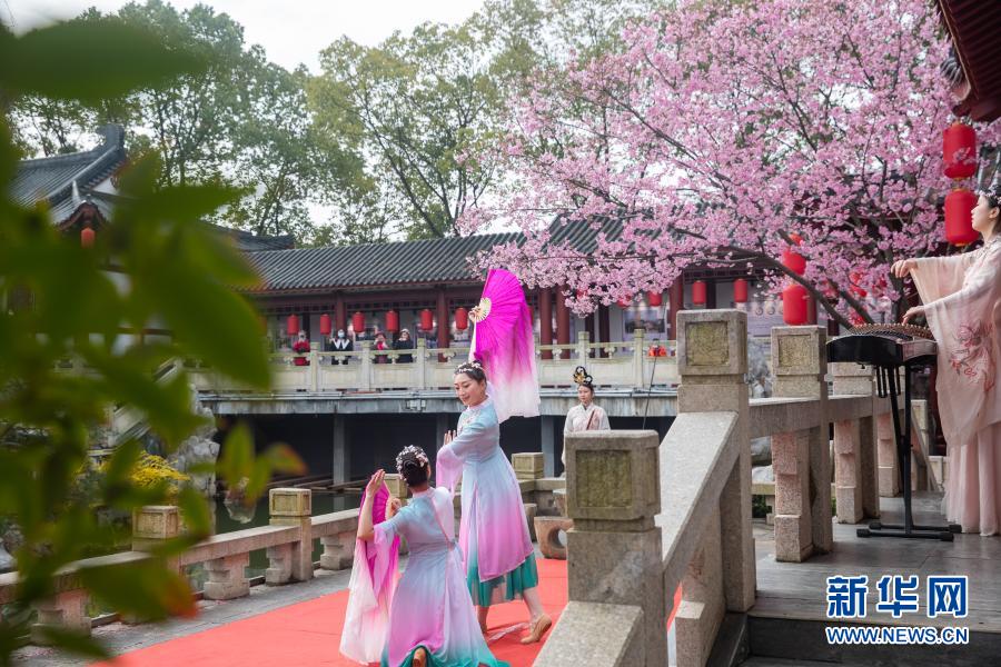 2月27日,演員在武漢東湖櫻花園表演節目。