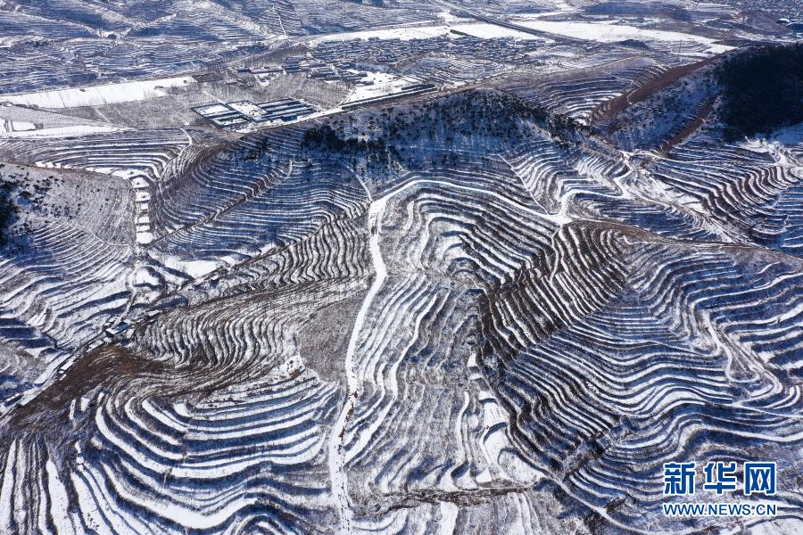 3月1日在河北省唐山市遷西縣新莊子鄉新莊子村拍攝的雪景(無人機照片) 。新華社發(王愛軍 攝)