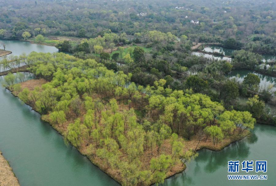 西溪濕地內植被吐出新綠(3月2日攝,無人機照片)。