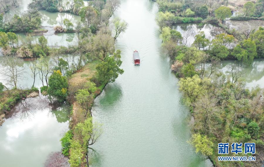 3月2日,游船行駛在西溪濕地水道上(無(wú)人機(jī)照片)。