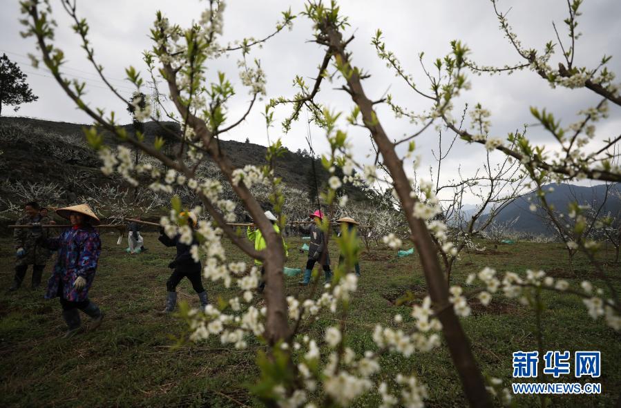 3月2日,村民在貴州省銅仁市江口縣閔孝鎮提紅村過江屯翠紅李種植基地進行春管作業。新華社發(李鶴 攝)