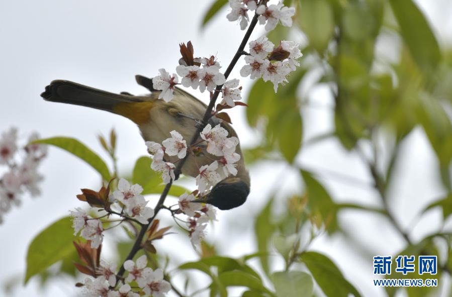 3月2日,在湖北省恩施土家族苗族自治州宣恩縣貢水河國家濕地公園,一只黃臀鵯在花枝上停留。新華社發(宋文 攝)