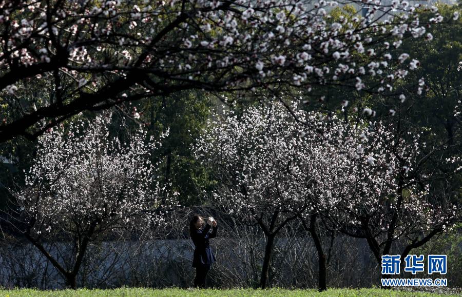 3月2日,游客在蘇州上方山國家森林公園內觀賞杏花。新華社發(杭興微 攝)