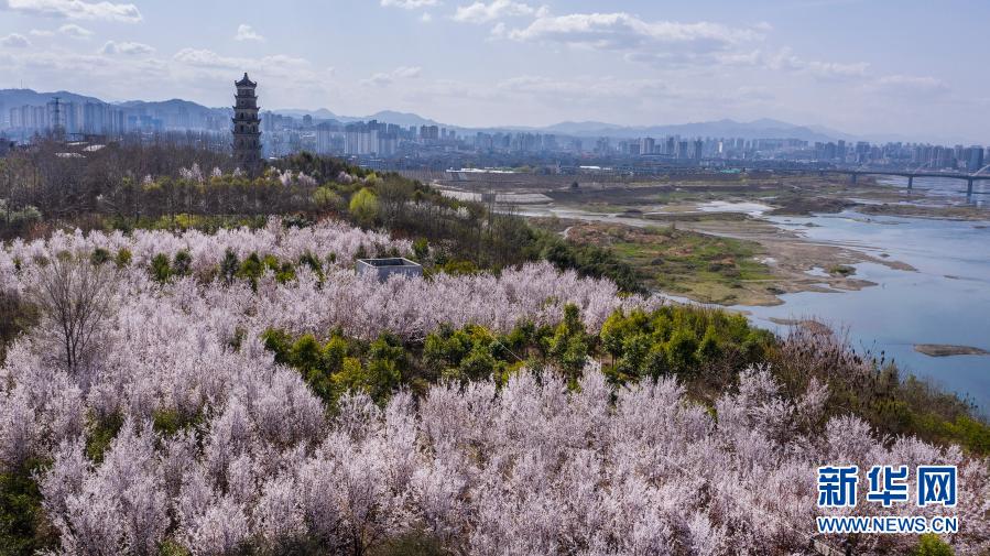 3月3日,漢江之畔的安康市城東新區(qū)鮮花盛開(無人機照片)。近日,秦巴山區(qū)的陜西省安康市春暖花開,市民紛紛走出戶外,徜徉花海,享受春光。新華社記者 陶明 攝