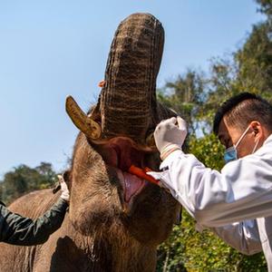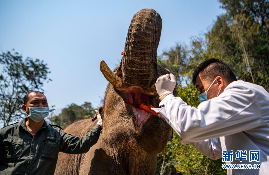 “象爸爸”為一頭名叫“小強”的大象檢查口腔(3月6日攝)。