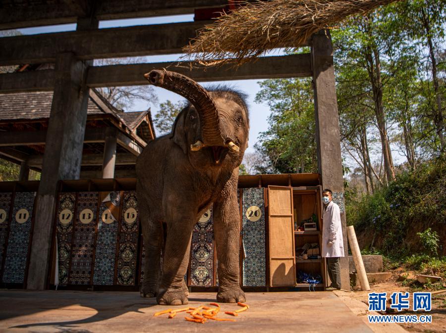 “象爸爸”為一頭名叫“小強”的大象測量體重(3月6日攝)。新華社記者 江文耀 攝