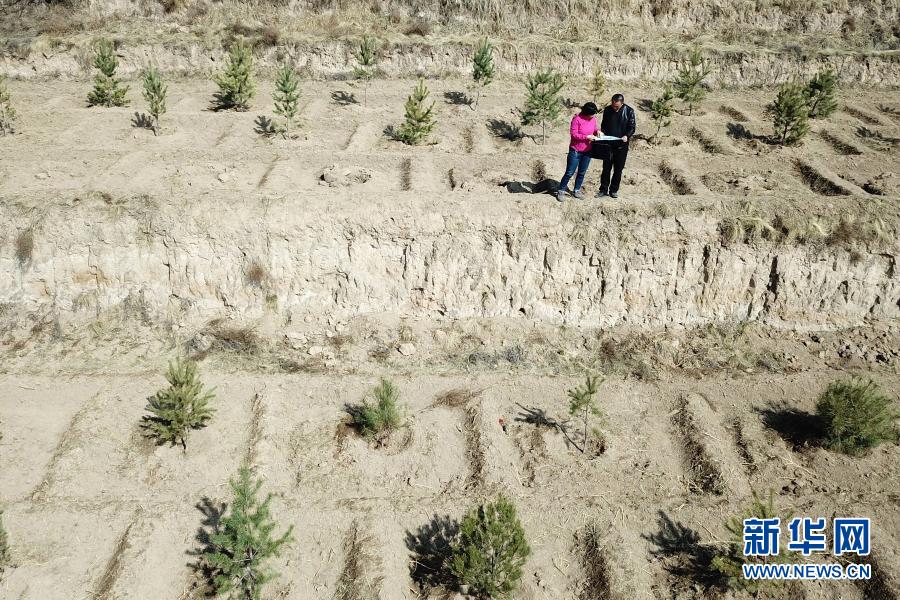 3月11日,在平涼市崆峒區白水鎮焦莊村北山,張文玉(左)和同事討論植樹造林細節(無人機照片)。