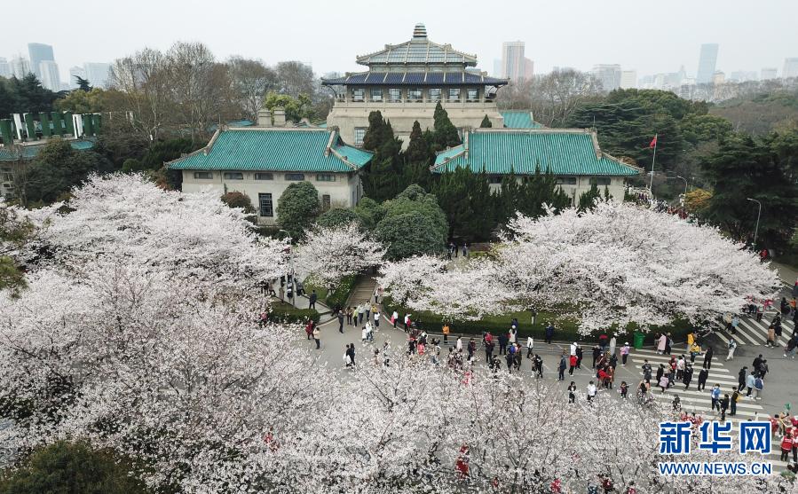 3月13日,來自各地的援鄂醫護人員在武漢大學校園共赴櫻花之約(無人機照片)。新華社記者 程敏 攝