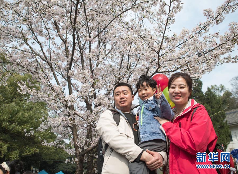 3月13日,遼寧援鄂醫(yī)療隊(duì)丹東市中心醫(yī)院護(hù)士李杰(右)與家人在武漢大學(xué)櫻花樹下合影。新華社記者 肖藝九 攝