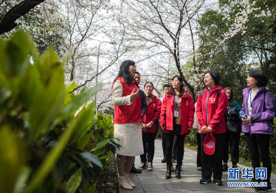 3月13日,武漢大學志愿者為安徽援鄂醫療隊員介紹武漢大學歷史。新華社記者 肖藝九 攝