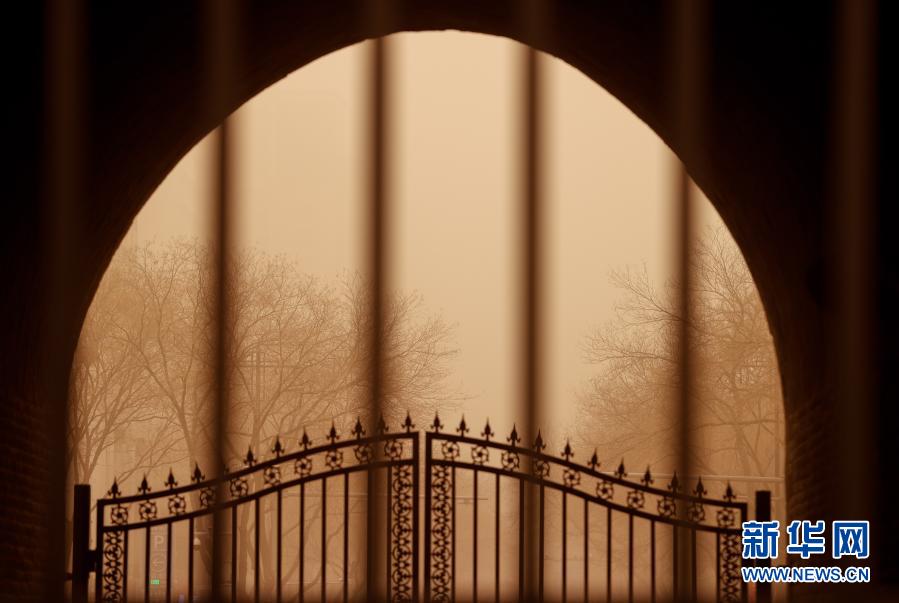 這是3月15日拍攝的沙塵中的寧夏銀川鼓樓拱門。當(dāng)日,我國北方多地出現(xiàn)沙塵天氣。新華社記者 楊植森 攝
