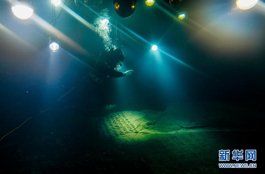 3月15日,在長江水下40多米的白鶴梁題刻無壓容器罩內,潛水員在進行清理作業。新華社記者 劉潺 攝