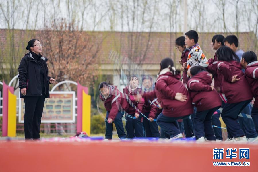 騎路小學劉彥老師(左一)指導同學們練習"大網繩跳"(3月9日攝)。新華社記者 李博 攝