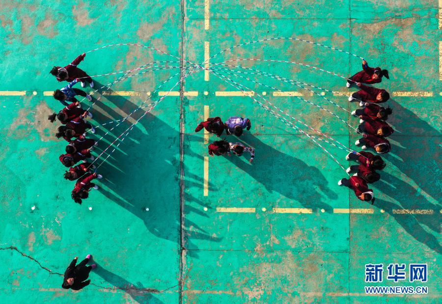 騎路小學的學生們在大課間練習“大網繩跳”(3月10日攝,無人機照片)。新華社記者 楊磊 攝