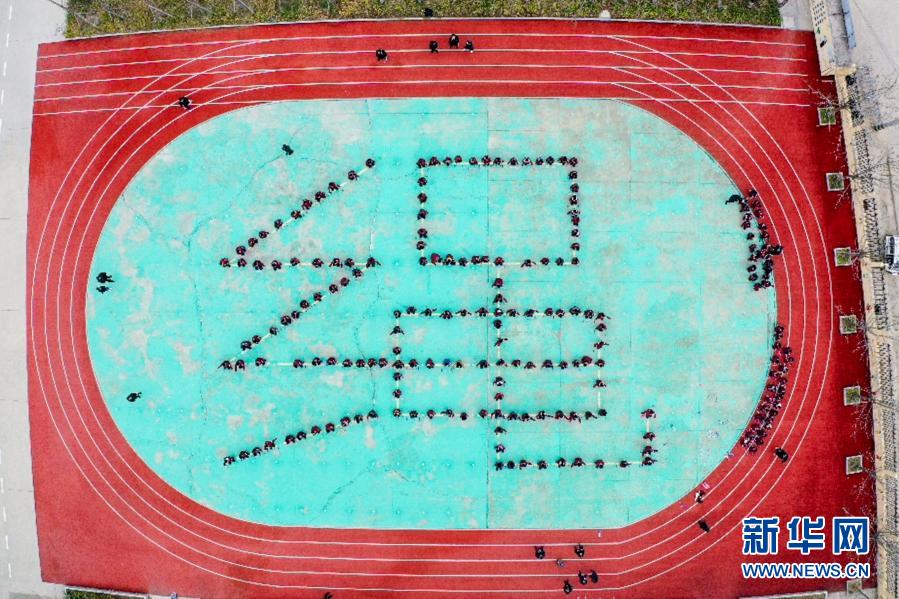 騎路小學的學生們在操場上排列站隊成“繩”字造型(3月9日攝,無人機照片)。新華社記者 李博 攝