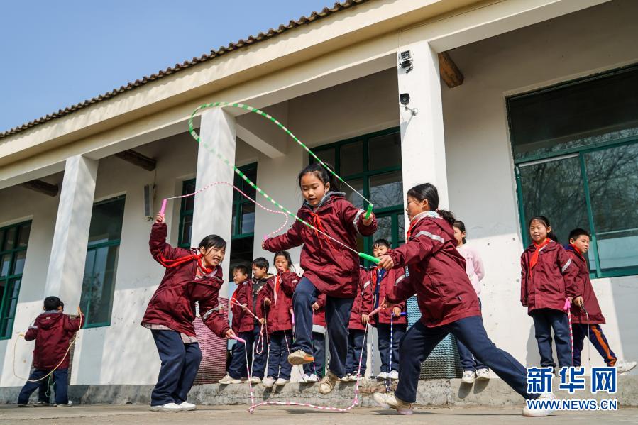 騎路小學的學生們在課間練習跳繩(3月10日攝)。新華社記者 李博 攝