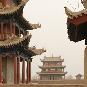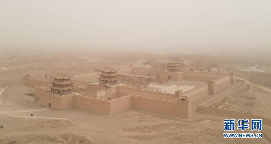 當日,甘肅河西走廊部分地區出現浮塵天氣,嘉峪關關城被浮塵籠罩。
