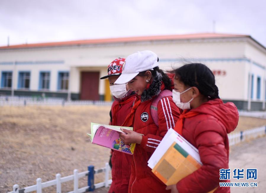 3月16日,在索加鄉寄宿小學,晚餐結束后,青梅才吉(中)和同學在校園內。新華社記者 張宏祥 攝