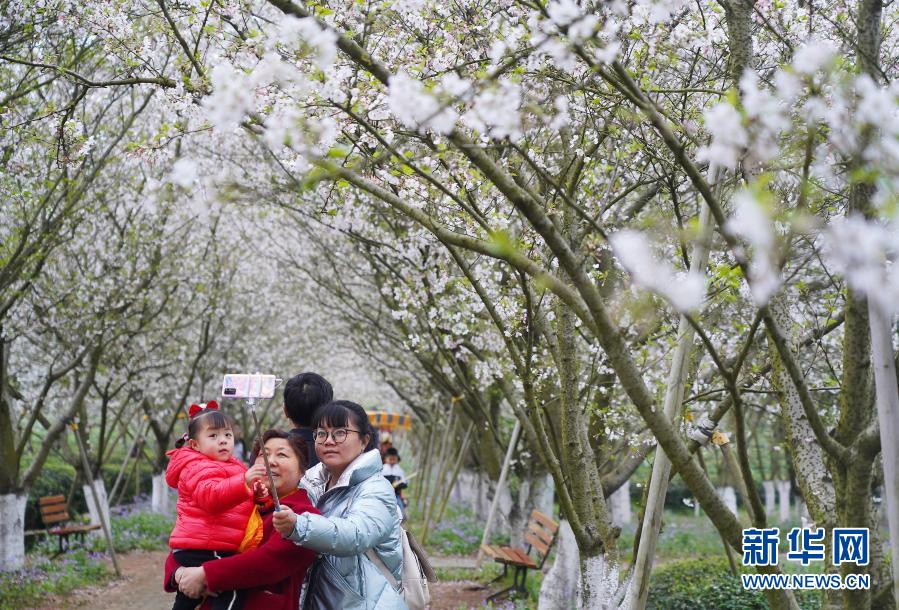 3月20日,游人在江西省南昌縣鳳凰溝景區櫻花谷拍照留念。