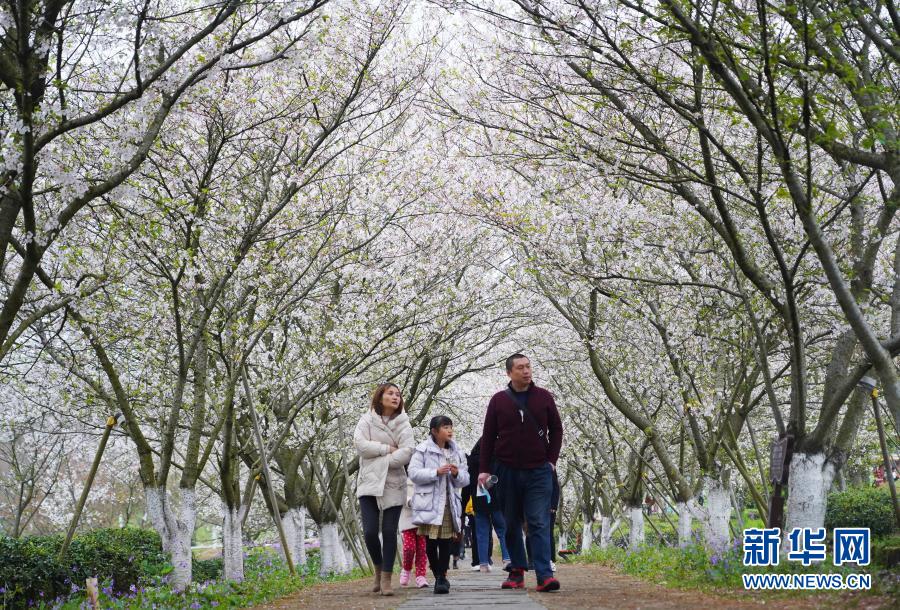 3月20日,游人在江西省南昌縣鳳凰溝景區(qū)觀賞盛開的櫻花。