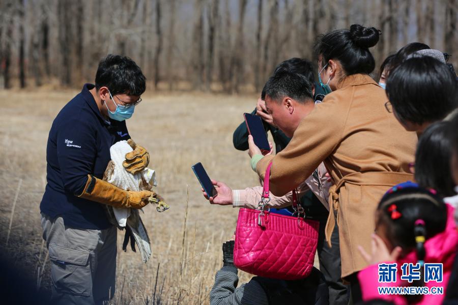 3月20日,救助大鵟的市民朱海鶇(左二)在拍攝大鵟的環志。新華社記者 李京 攝