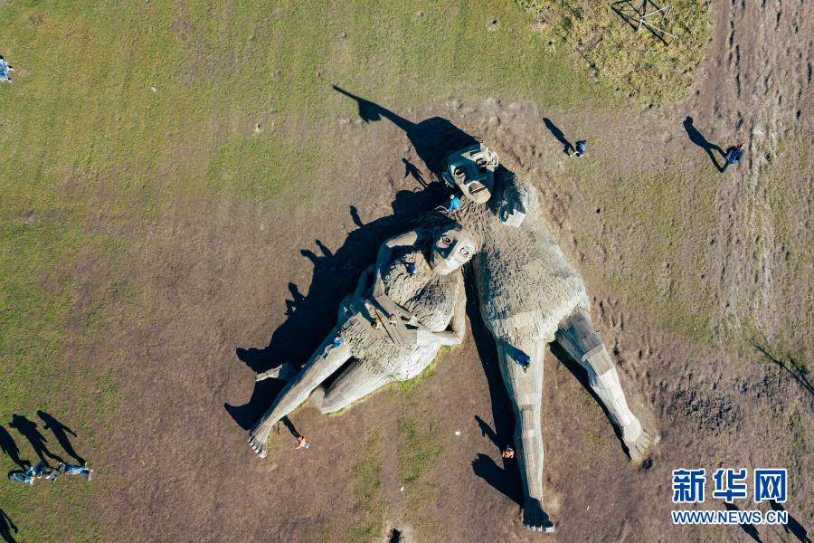 這是3月20日在比利時(shí)博姆市的德舒爾森林公園拍攝的“巨人”雕塑(無人機(jī)照片)。新華社記者 張鋮 攝
