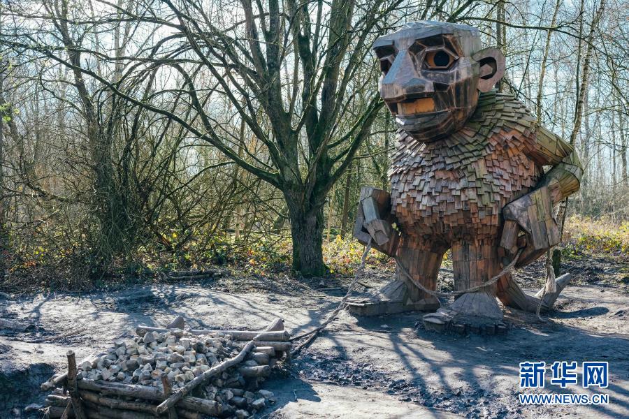 這是3月20日在比利時博姆市的德舒爾森林公園拍攝的一座“巨人”雕塑。新華社記者 張鋮 攝