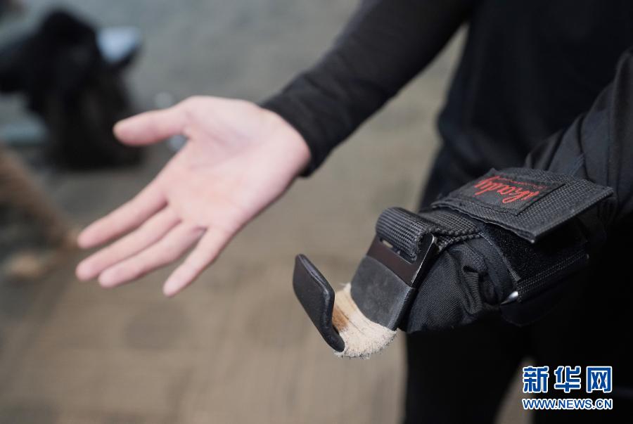 3月19日,冬殘奧會國家集訓隊單板滑雪運動員紀立家在運動員駐地進行體能訓練時展示他穿戴的俗名“鉤子”的輔助器械。新華社記者 才揚 攝