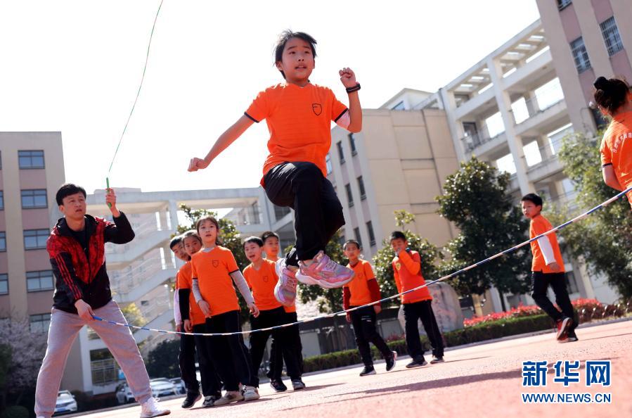 3月23日,在合肥市大通路小學新海校區(qū),學生在大課間練習花樣跳繩。