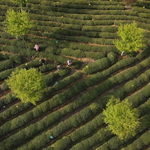 3月24日,茶農在黃山毛峰唐模標準化生態茶園里采茶(無人機照片)。