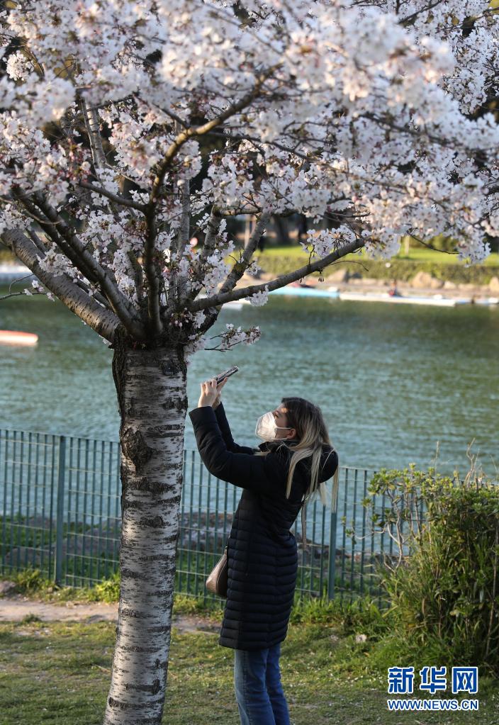 3月24日,佩戴口罩出行的市民在意大利首都羅馬一株盛開(kāi)的櫻花樹(shù)下拍照。新華社記者 程婷婷 攝
