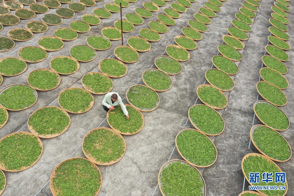 4月2日,制茶師傅在福鼎市佳陽畬族鄉的一家茶企業內攤放茶青。新華社記者 林善傳 攝