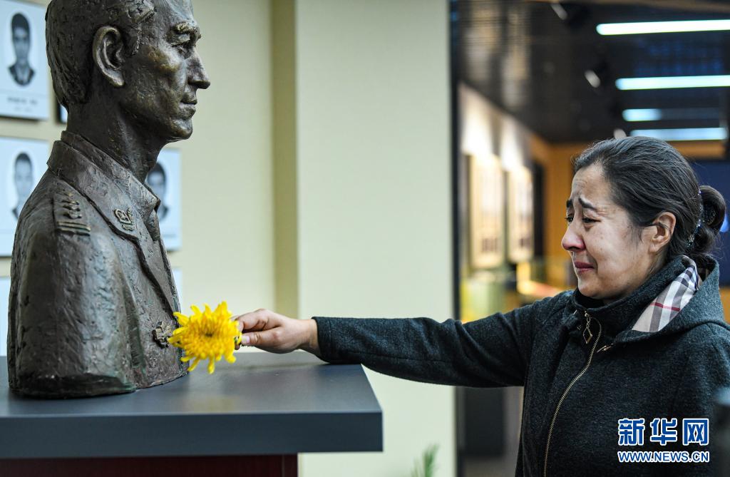 4月3日,在新疆警史館,瑪依努爾在愛人艾熱提的雕像前擺上菊花。